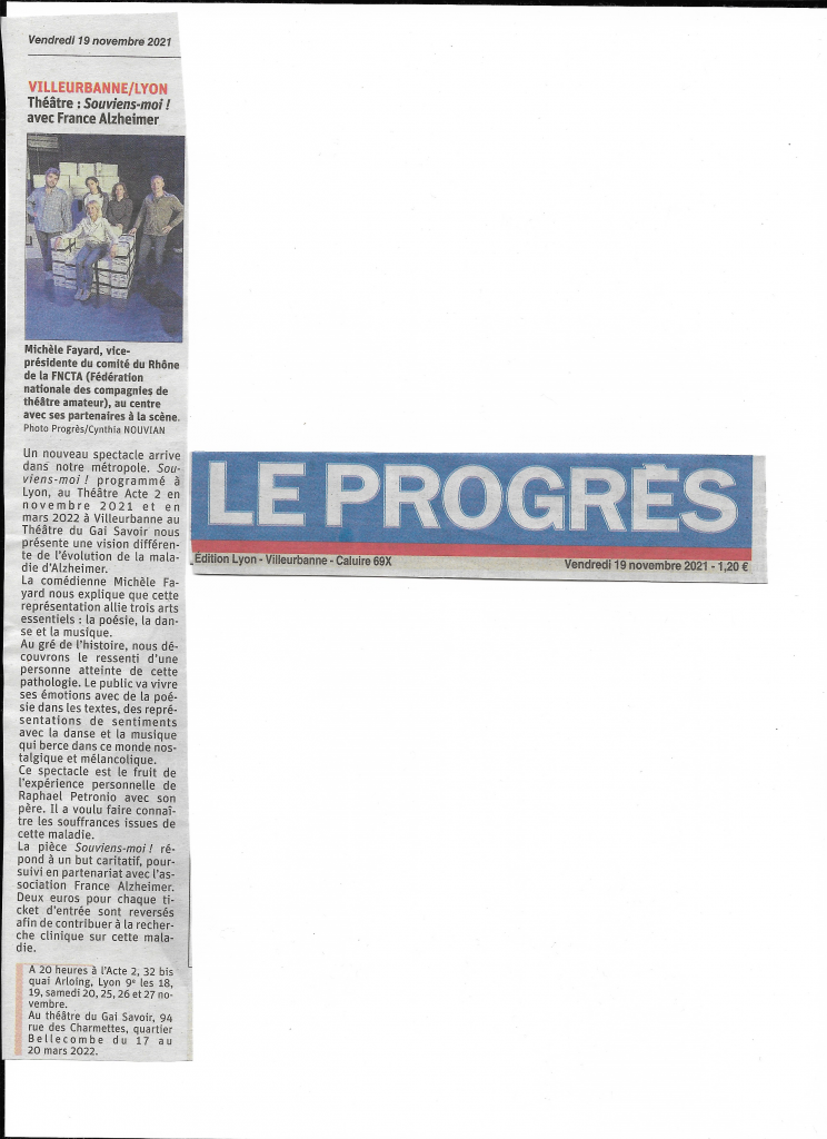 Le Progrès consacre plusieurs articles au spectacle Souviens-Moi, soulignant la singularité de son approche artistique et la justesse de son propos.